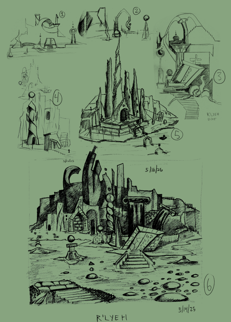 Hey all! This week in the sketchbook I’ve been trying to draw some “horrific” architecture. When I was flying back to New Mexico from Wyoming I was reading Lovecraft’s “The Call of the Cthulhu”. Not for the first time, but I was getting inspired with all the horrific imagery portrayed. Specifically the city of R’lyeh where the ancient ones dwell. Here is a synopsis of what the city is supposed to be like: